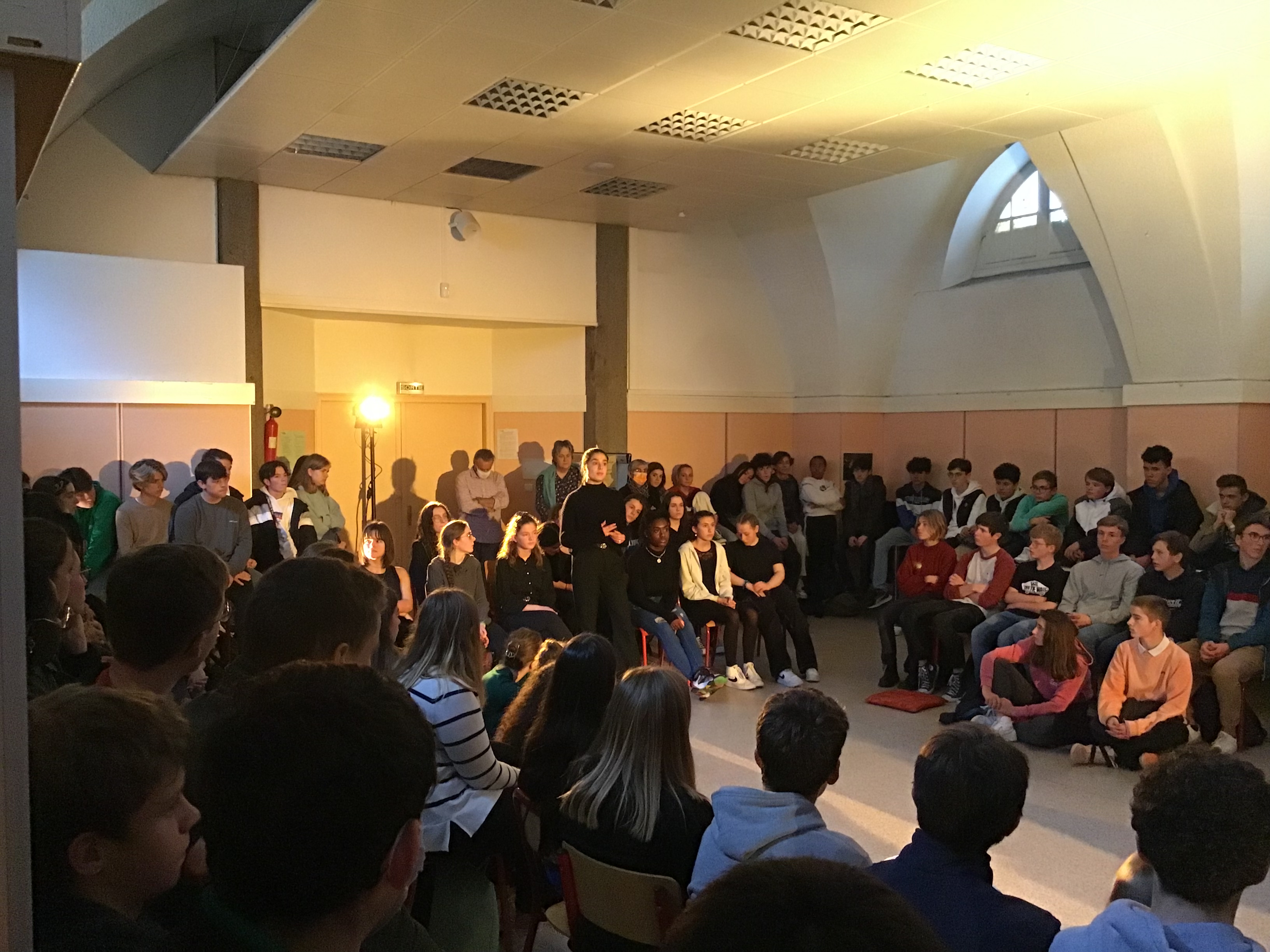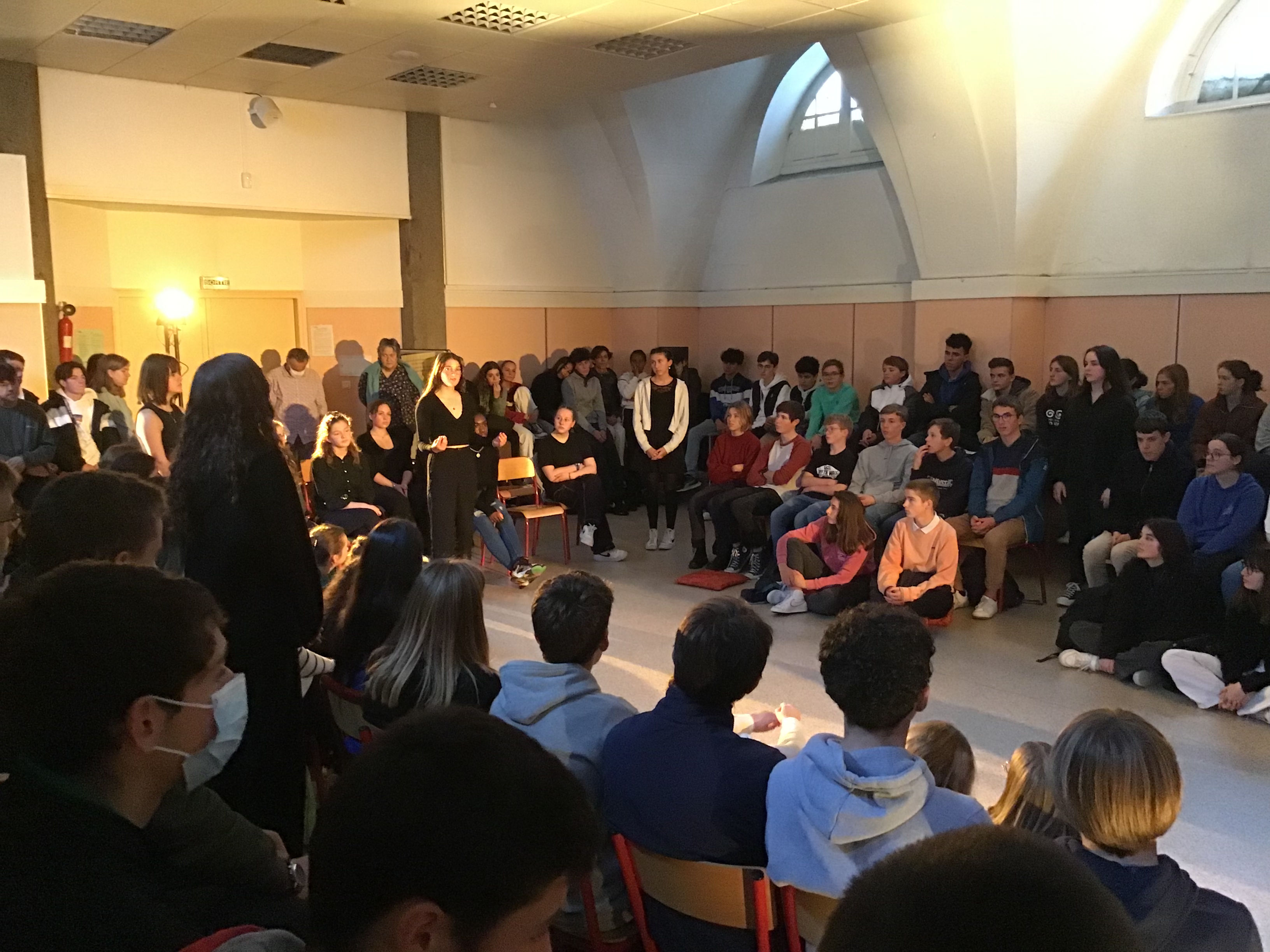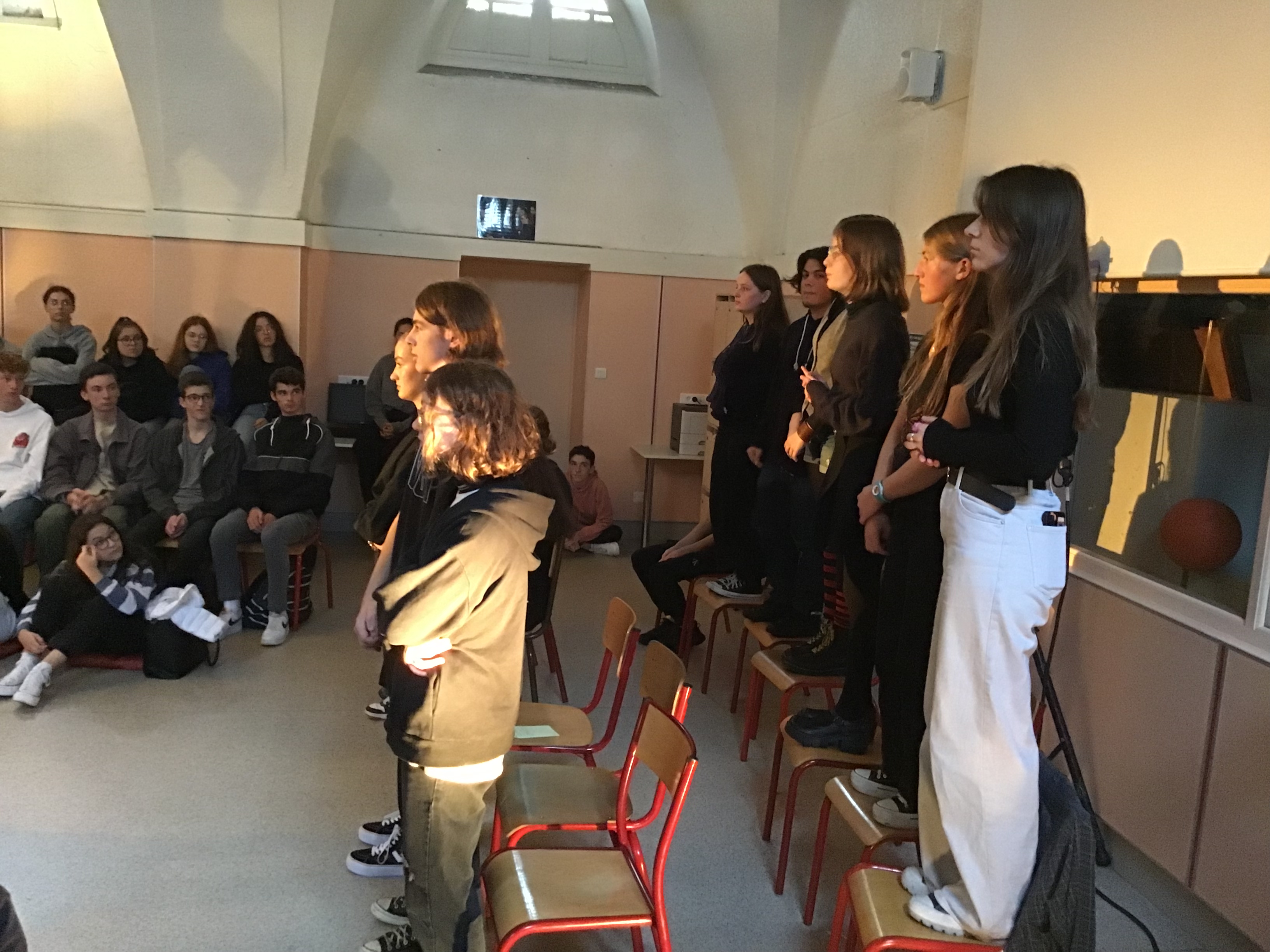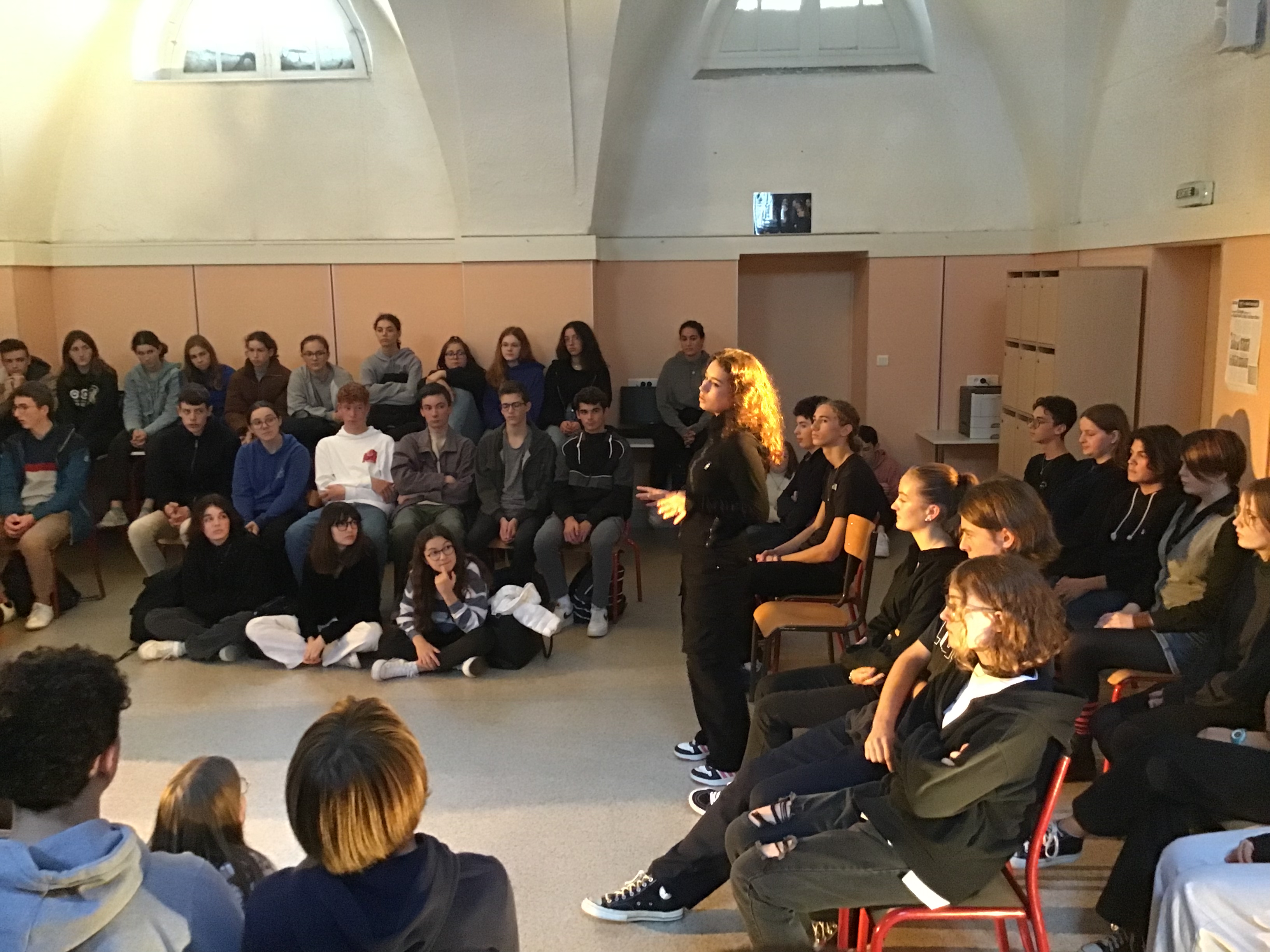 Vendredi 14 octobre, les 25 élèves de Première de la spécialité HLP ont fait une représentation devant un parterre d'élèves de Seconde. Celle-ci était l'aboutissement d'un atelier de quatre jours sur l'art du discours (enseignement pluridisciplinaire centré sur une dimension de la culture humaniste permettant de former un jugement réfléchi et un esprit critique).