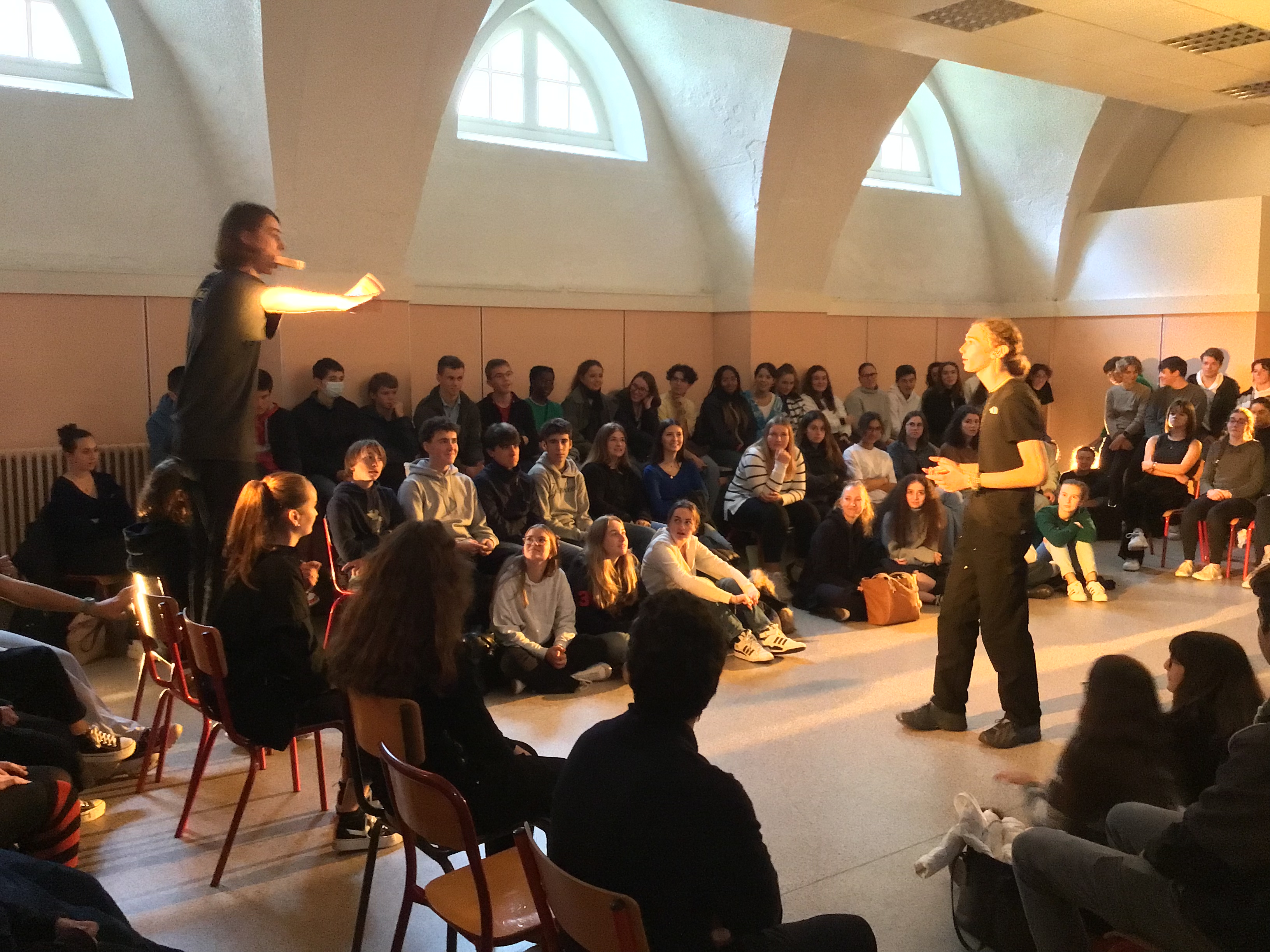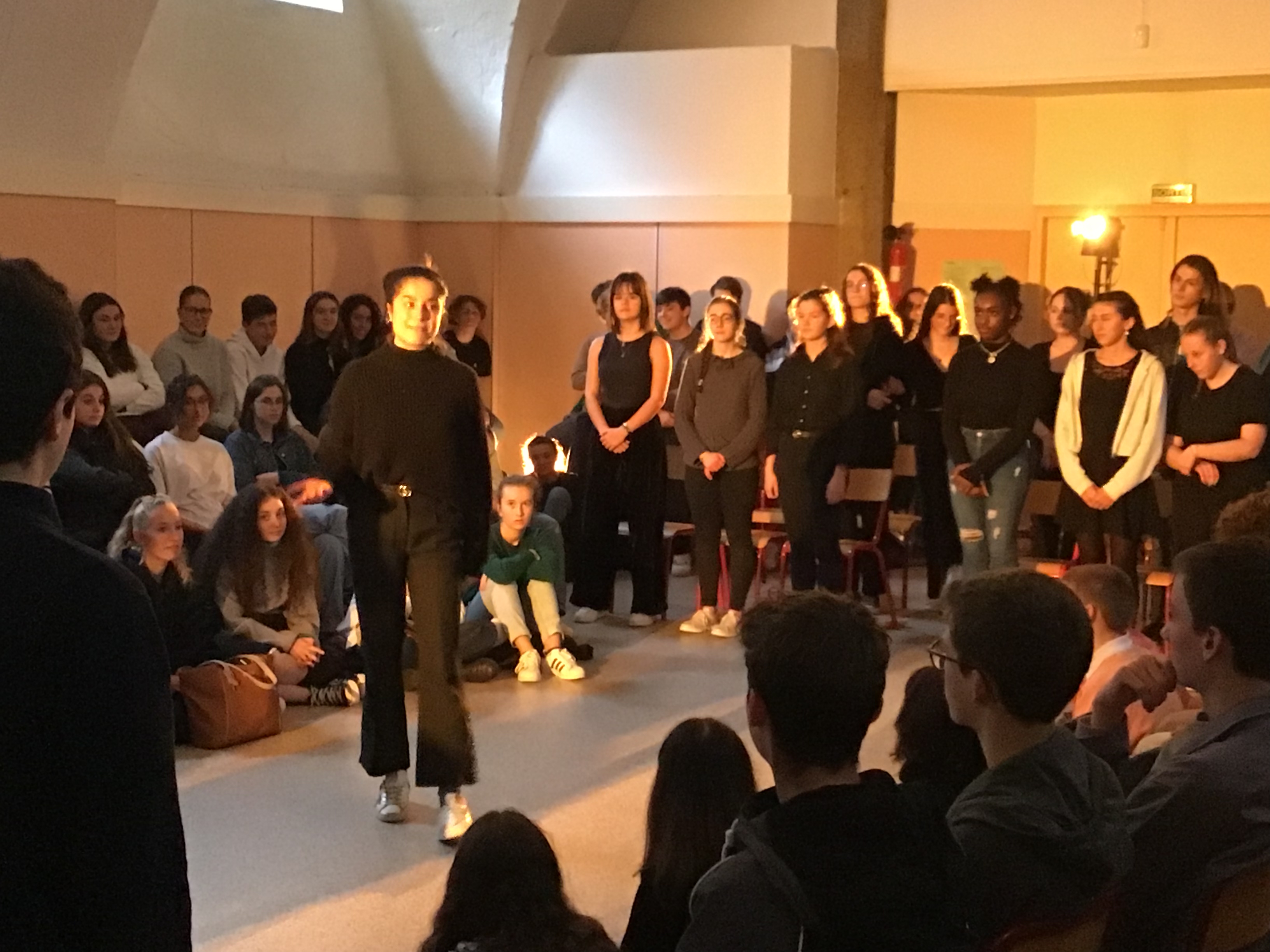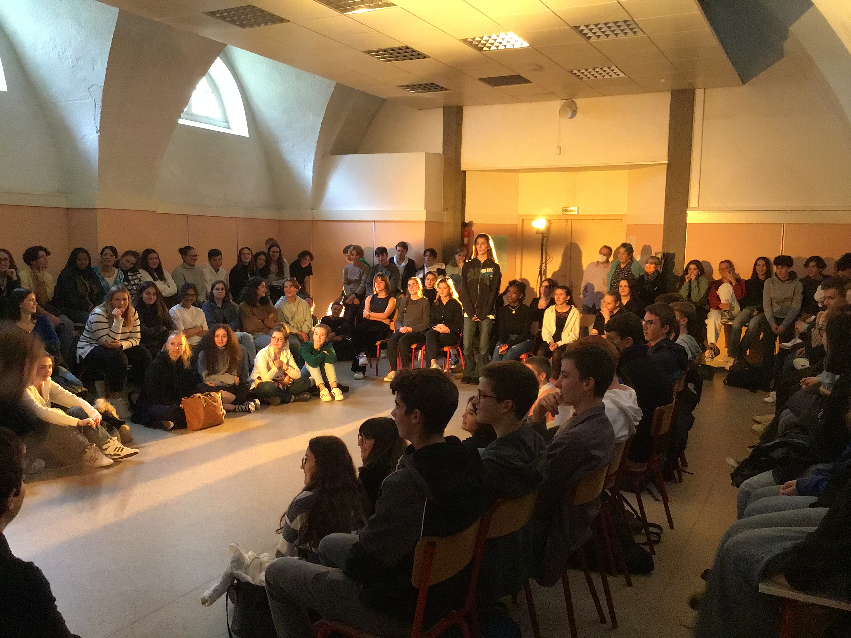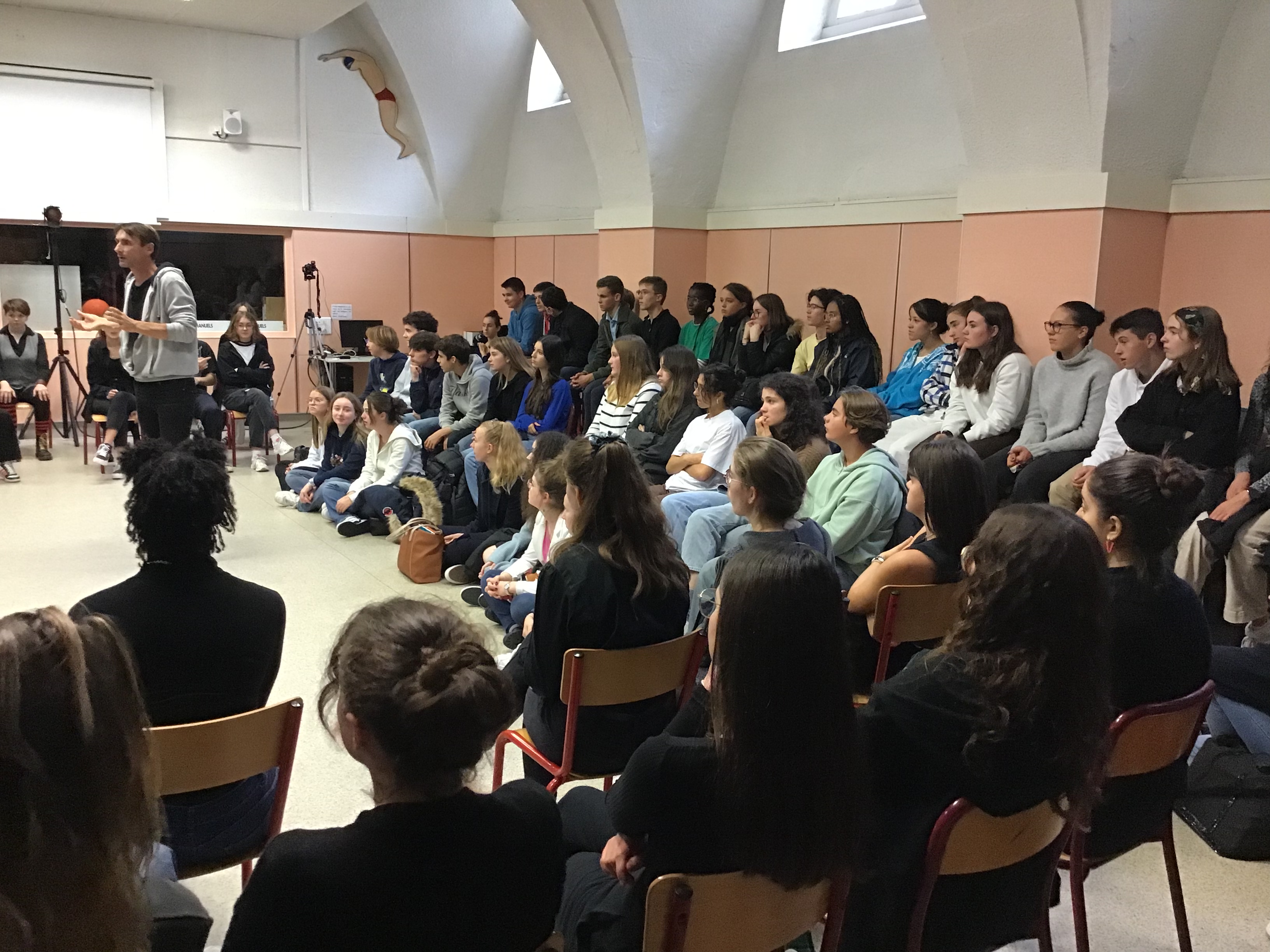 Vendredi 14 octobre, les 25 élèves de Première de la spécialité HLP ont fait une représentation devant un parterre d'élèves de Seconde. Celle-ci était l'aboutissement d'un atelier de quatre jours sur l'art du discours (enseignement pluridisciplinaire centré sur une dimension de la culture humaniste permettant de former un jugement réfléchi et un esprit critique).