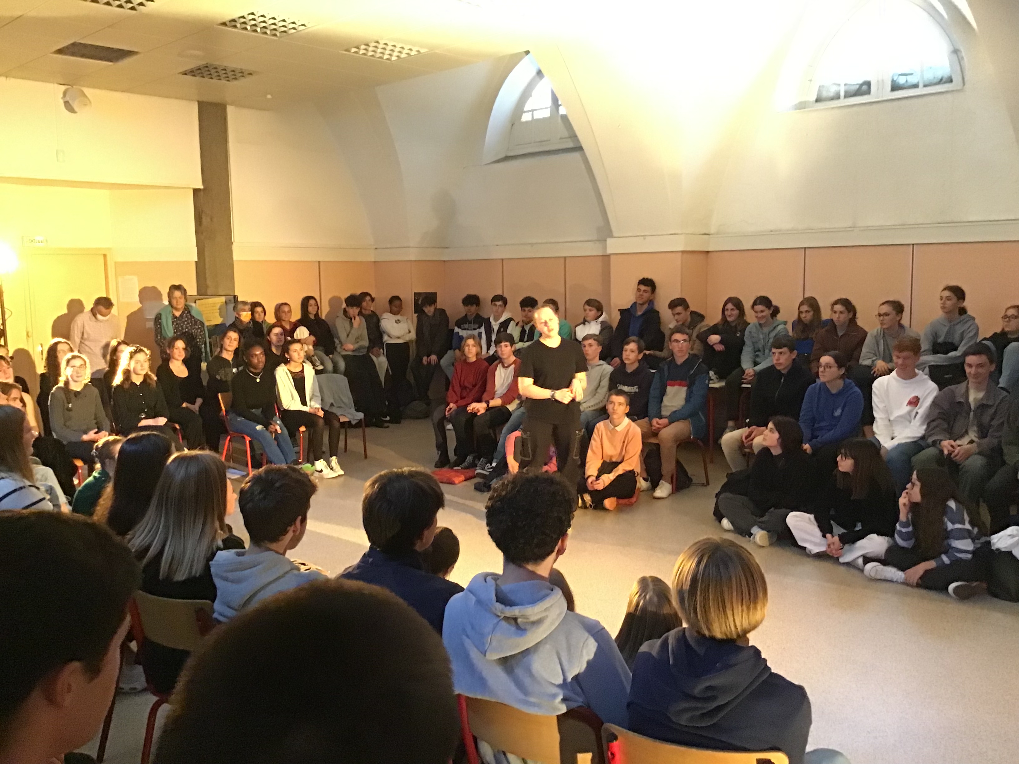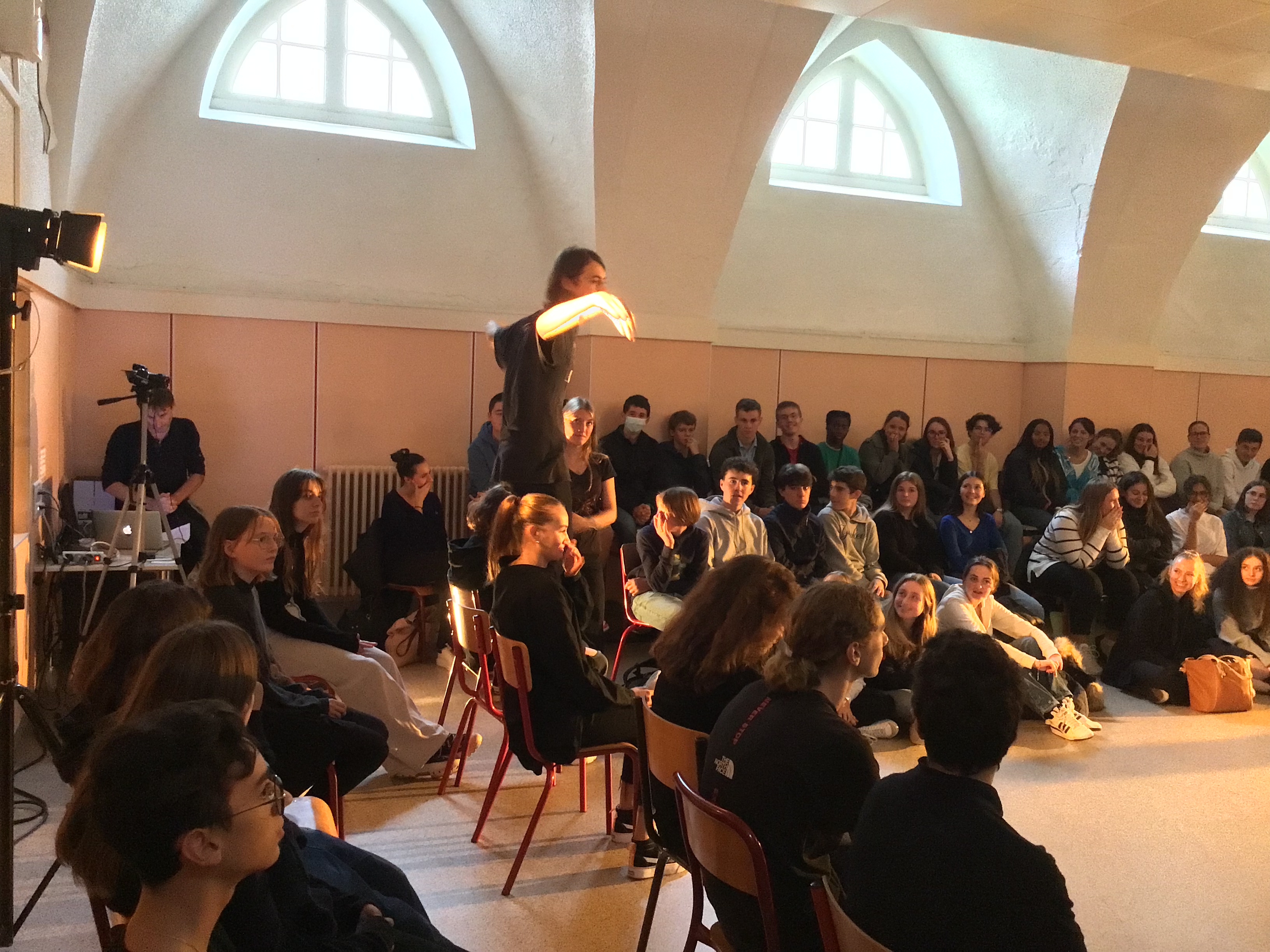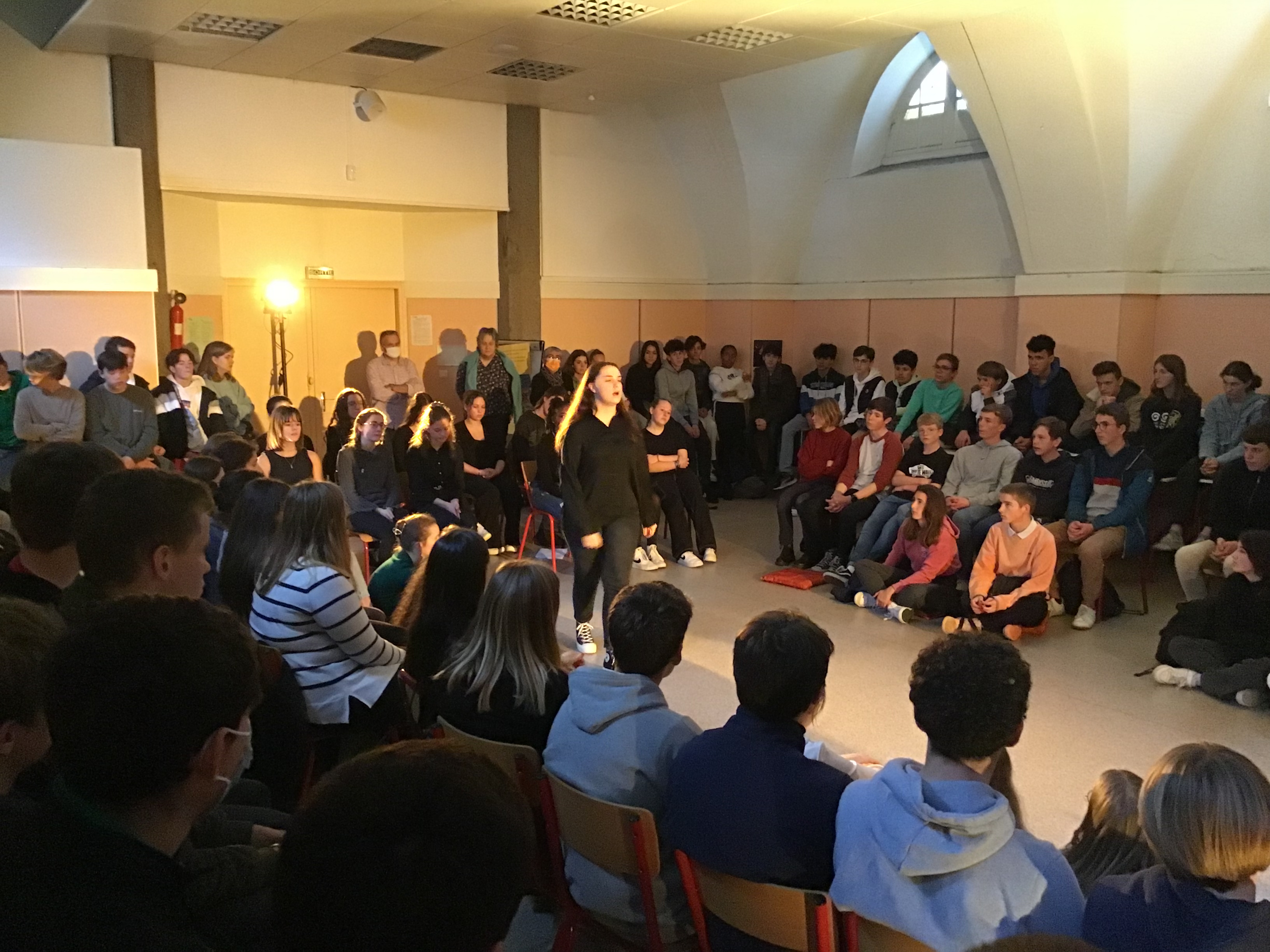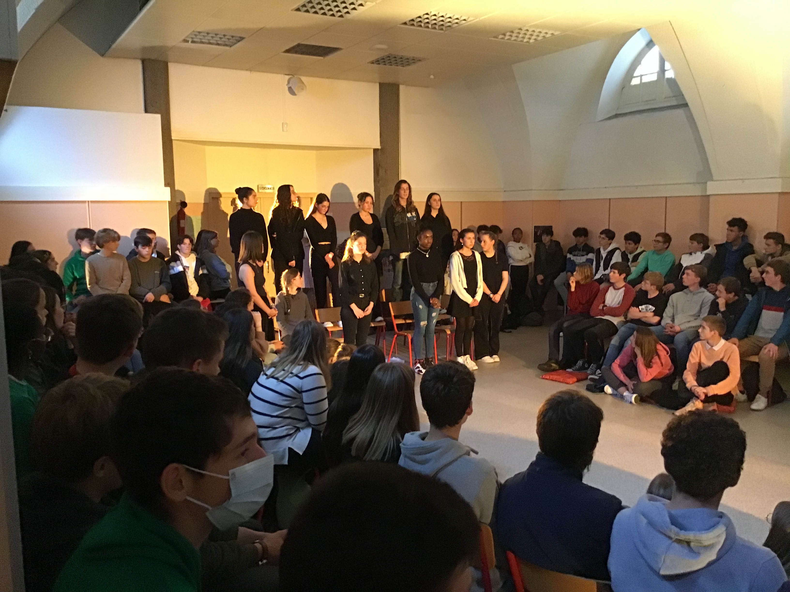 Vendredi 14 octobre, les 25 élèves de Première de la spécialité HLP ont fait une représentation devant un parterre d'élèves de Seconde. Celle-ci était l'aboutissement d'un atelier de quatre jours sur l'art du discours (enseignement pluridisciplinaire centré sur une dimension de la culture humaniste permettant de former un jugement réfléchi et un esprit critique).